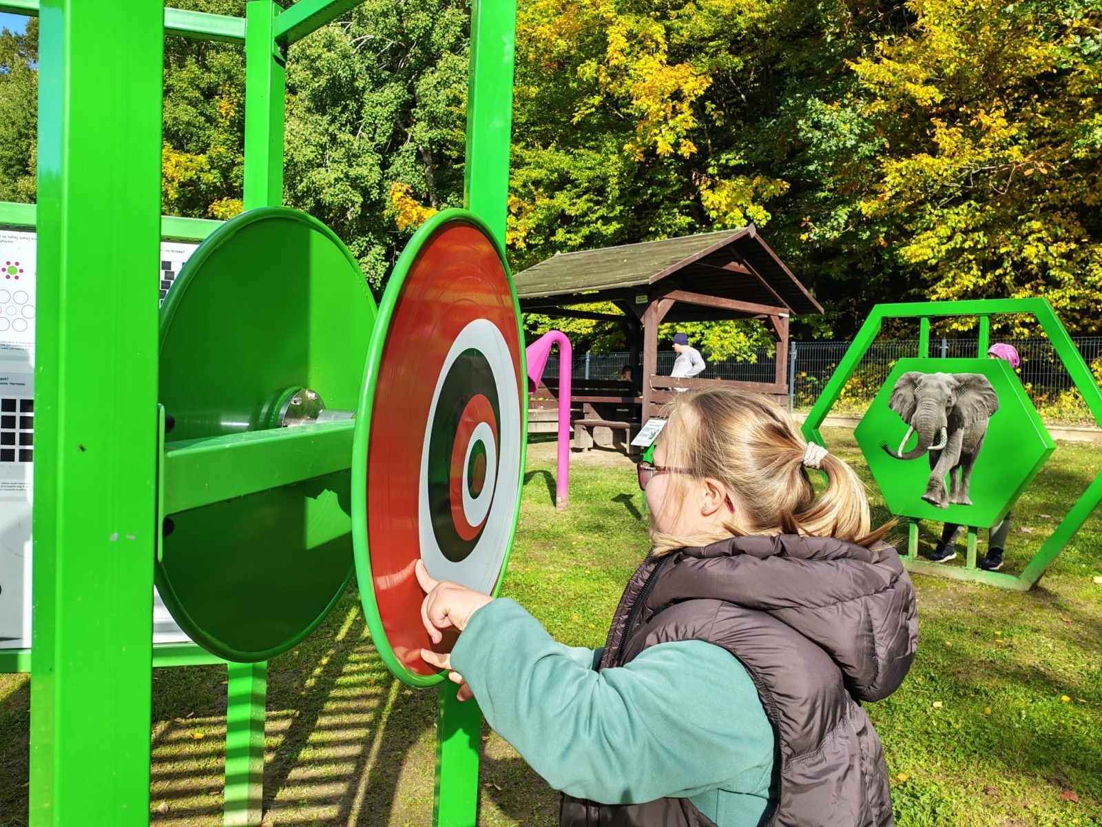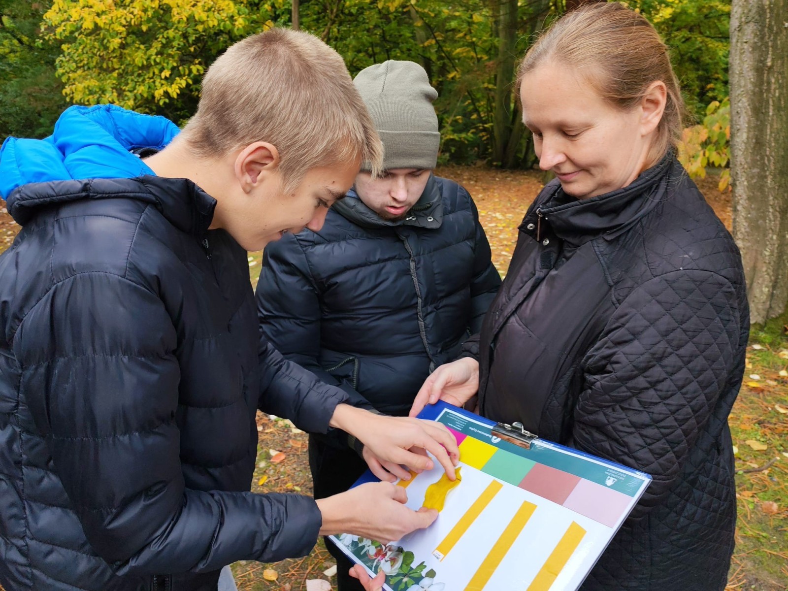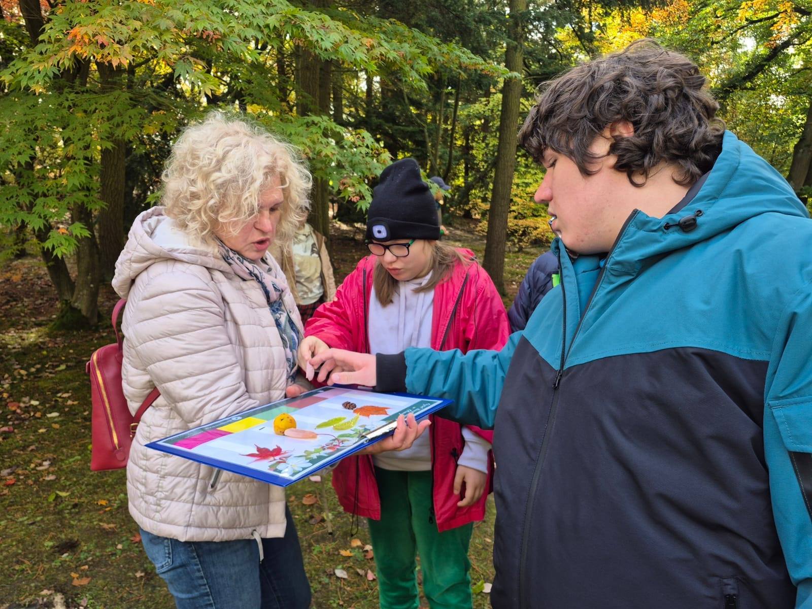 Podczas spaceru po parku towarzyszyła nam pani leśnik, która poprowadziła ciekawe warsztaty terenowe. Dowiedzieliśmy się wielu fascynujących rzeczy o drzewach i krzewach pochodzących z różnych zakątków świata. Następnie uczniowie pracowali zespołowo, biorąc udział w zabawie polegającej na odnajdywaniu darów jesieni w różnych kolorach.