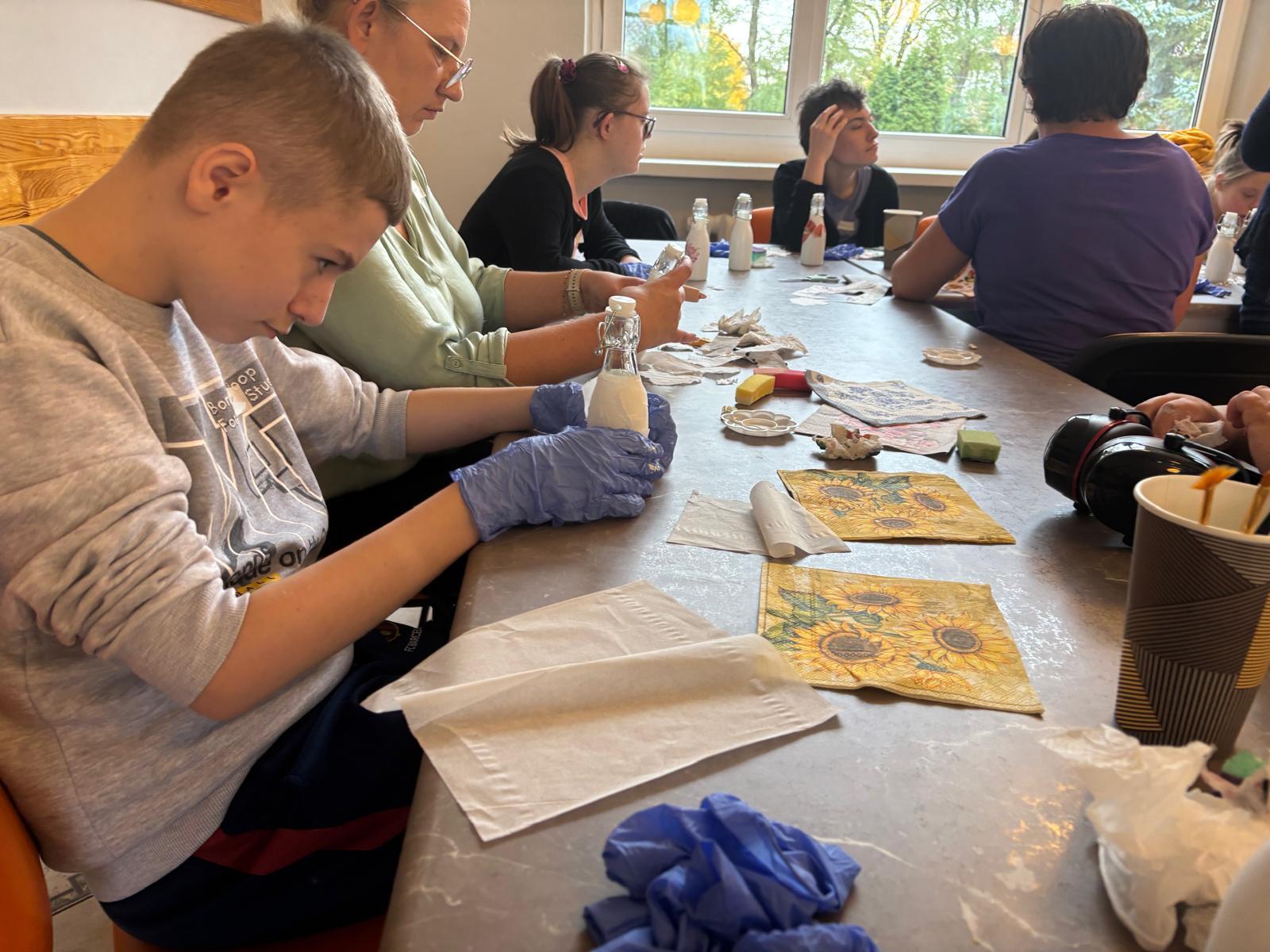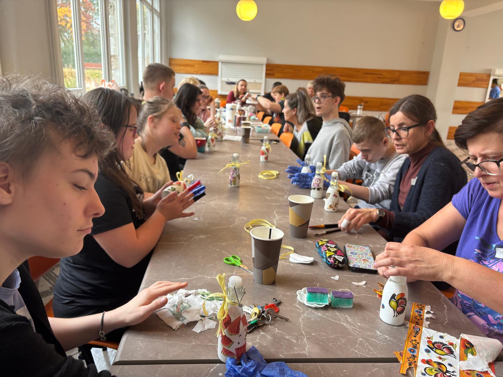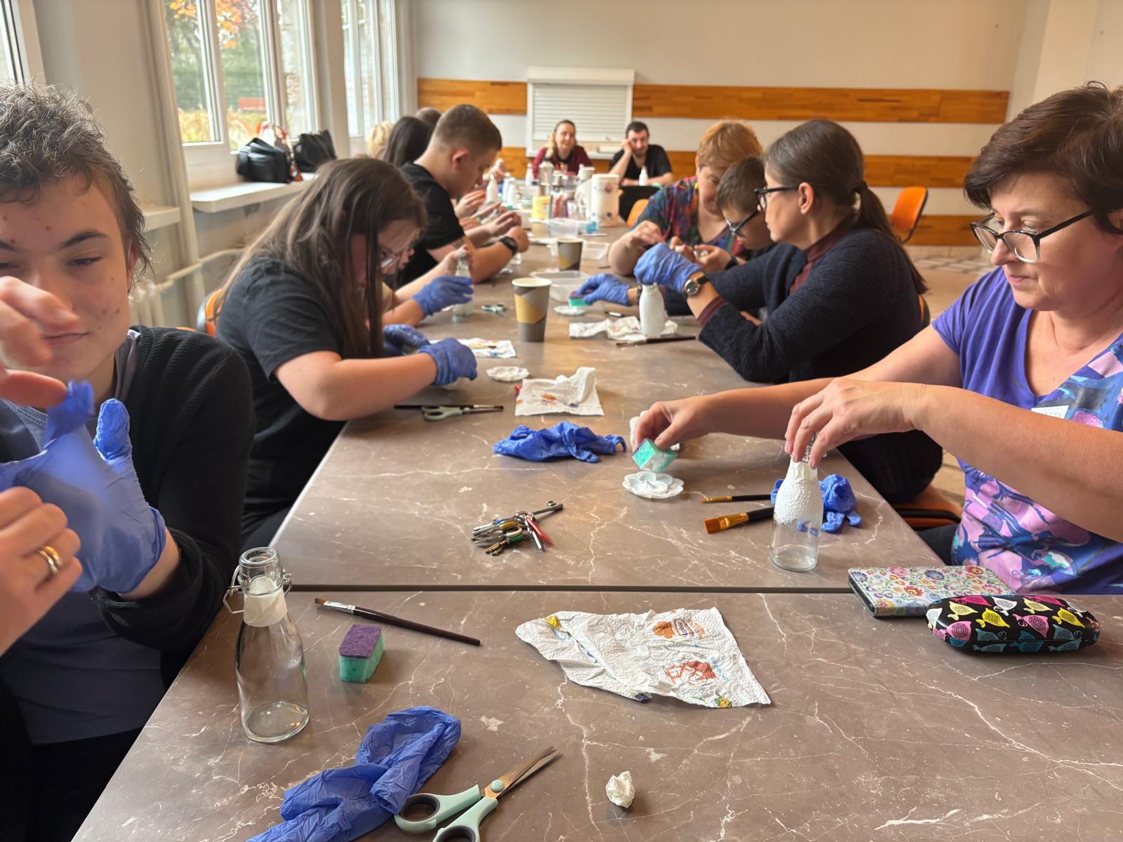 Pierwsze spotkanie miało charakter warsztatów rękodzielniczych, podczas których uczestnicy poznali technikę decoupage i wspólnie ozdabiali szklane butelki. Zajęcia przebiegły w miłej i twórczej atmosferze, sprzyjającej integracji międzypokoleniowej, wymianie doświadczeń oraz rozwijaniu kreatywności.